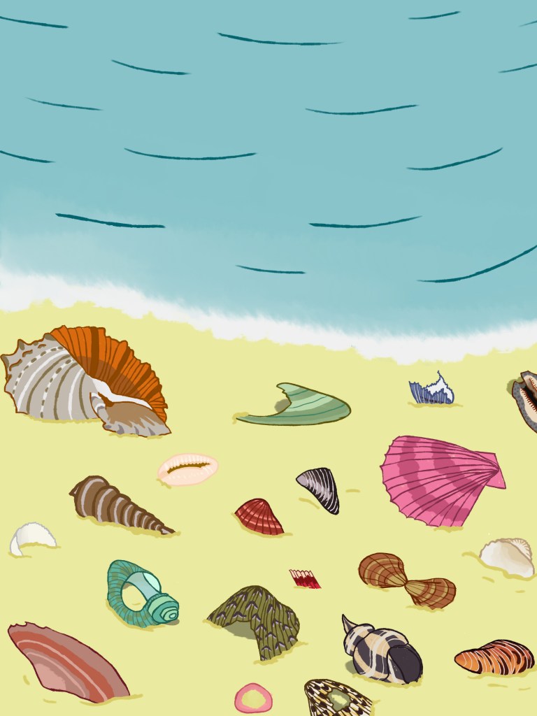 The artist told me they decided on a setting the place that, not only themself, but most people who struggle with body image believe can be the ‘worst place on earth’ – the beach. The beach has always been the one place where people whose bodies don’t come under the ‘norm’ set by societal standards feel excluded, exposed, insecure, and miserable. To combat this feeling, the artist drew several different seashells to represent body neutrality, with the idea that every single seashell, in its on way, is beautiful. Just like all humans are.